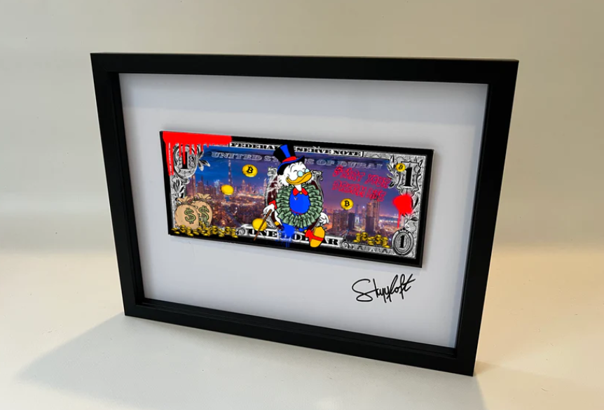 Außergewöhnliche Pop Art Kunst von Skyyloft - das Motiv "DUBAI LIFE DOLLAR" im Objektrahmen mit Museumsglas.