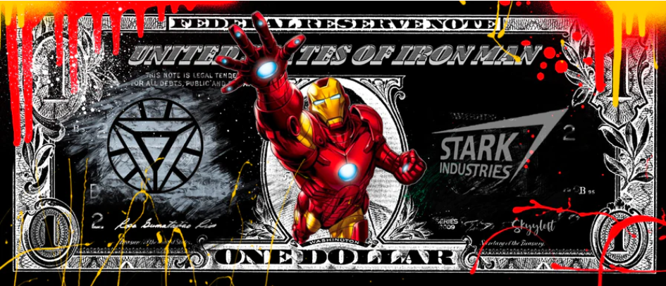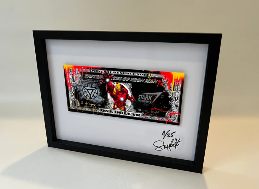 Außergewöhnliche Pop Art Kunst von Skyyloft - das Motiv "IRON MAN DOLLAR" im Objektrahmen mit Museumsglas.